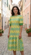 A: Dry clean recommended to preserve the crepe fabric’s structure, the puff sleeve volume, and the sharpness of the multicolour zigzag print.